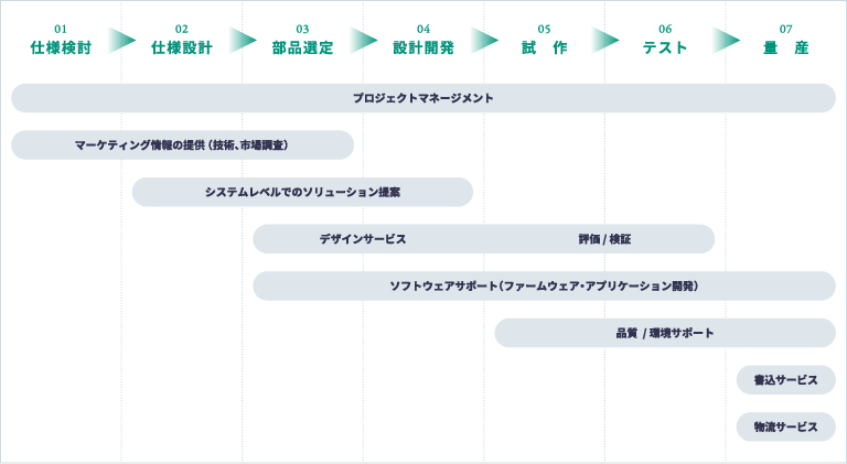 プロジェクトマネージメントはもとより、評価・検証、品質・環境サポート等を組み合わせたFAEサポートをご提供いたします。